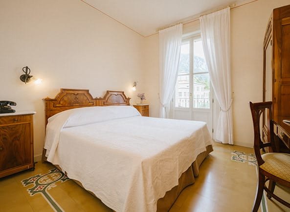 Vivete la magia del lago dalla nostra camera iconica, tra arredi d’epoca e due ampi balconi o una terrazza soleggiata che si affacciano direttamente sull’acqua del Garda.