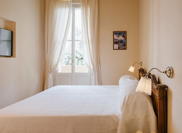 Il fascino essenziale della villa. Pur affacciandosi sul retro, in un’area tranquilla, questa camera offre tutto il comfort e il carattere della nostra dimora.